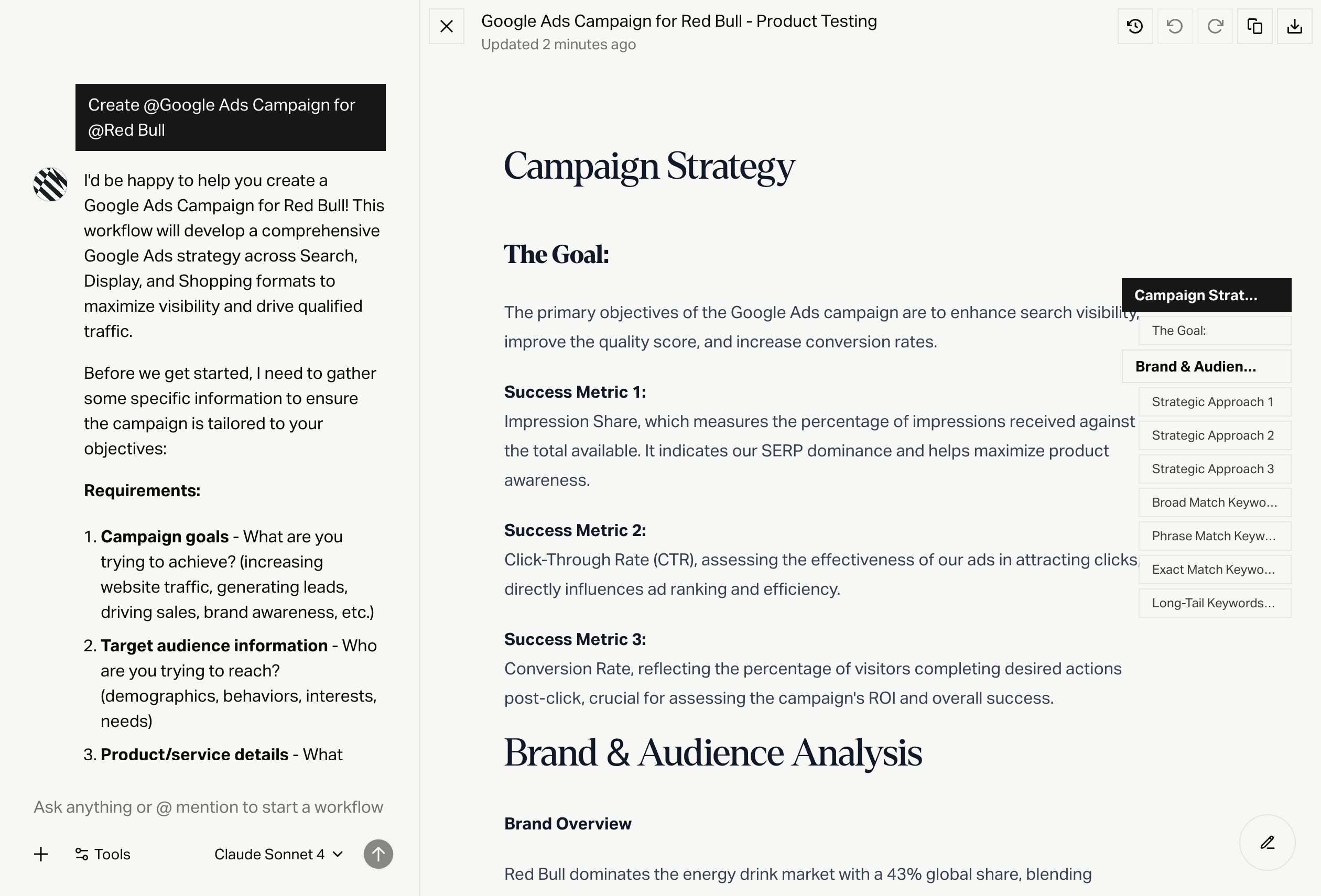Every workflow was written by a real marketing professional and includes live data analysis, competitor insights, and market research—giving you comprehensive brand research in seconds.